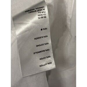 This is a preowned Free People We The Free Freya Poplin Tunic in optic white. This has an oversized fit, raw edge details, and distinctive asymmetrical, handkerchief-style hem with ruffled accents. It is made from 100% cotton poplin material. The top is very fairy pirate. It has a couple of makeup stains on the collar see upclose images for details.