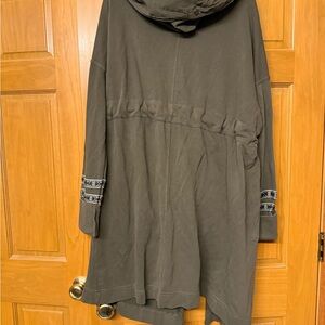 Stylish sweatshirt material utility jacket with unique embroidered details. Features a tie waist and relaxed fit. Ideal for casual wear.