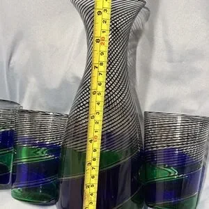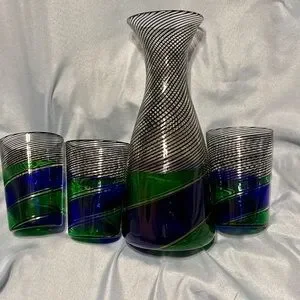 Vintage hand-blown art glass decanter set featuring a bold blue and green cased glass design with dramatic black spiral/string detailing.
