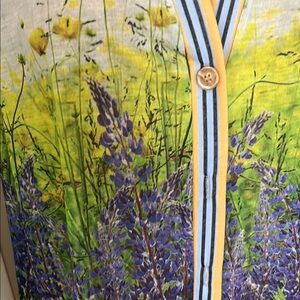 Vibrant floral cardigan. Features yellow, green, and blue hues. Perfect for layering.