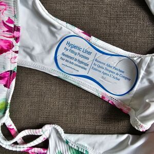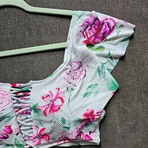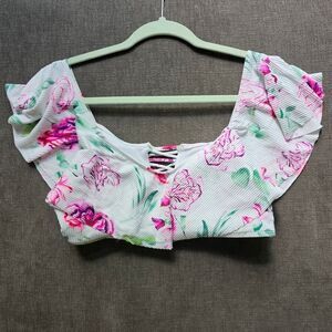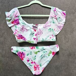 TiniBikini White & Pink Tropical florals Ruffle Ribbed Off-Shoulder Bikini Top & Bottoms