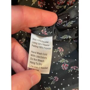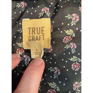 The True Craft women's puffer vest in size L is designed for casual wear during fall and winter. It features a solid blue polyester outer shell with a floral interior lining. The vest is sleeveless with a full front snap closure and includes two side pockets. It is not vintage and requires hand washing. Pre-owned condition.