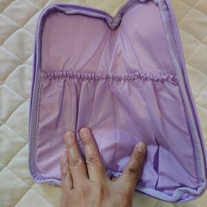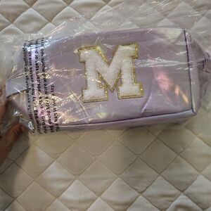 This chic iridescent makeup bag features a stylish gold 'M' design, perfect for organizing your beauty essentials with flair.