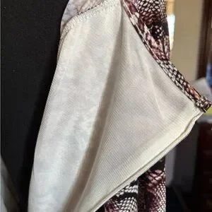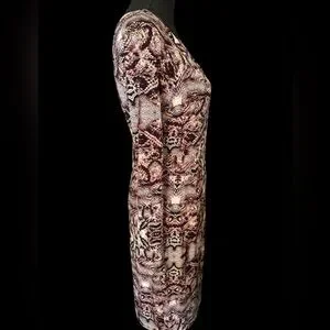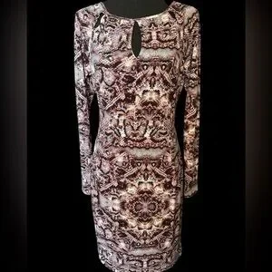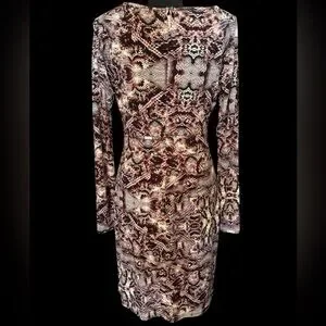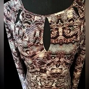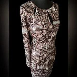 Stylish long sleeve bodycon dress with a snakeskin motiff. Pleated details along the waistline, completely lined , keyhole crew neck with cutout details. Pre owned in great condition, machine washable. Demand attention in this figure flattering dress.