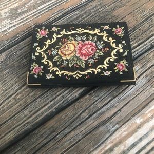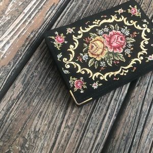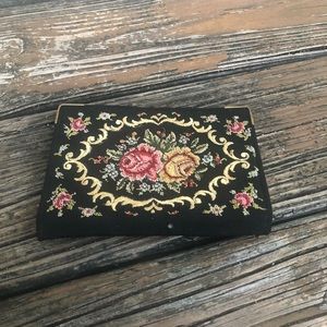 Floral Petit Point Embroidery Needlework Purse Evening Bag Fold-over Wallet Black Pink Yellow Vintage 50s 60s