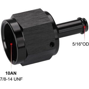 Specifications: Material: 6061 T6 billet aluminum Size: 10AN female to 5/16" hose barb, Straight Surface Treatment: Anodized black Features: - Anodized finish for strength, durability and anti-corrosion - These AN to hose barb fittings are designed for a wide range of automotive applications including fuel, oil or water lines - All fittings and adapters are fully compatible with gasoline and alcohol based fuels Notice: Professional installation is highly recommended!