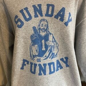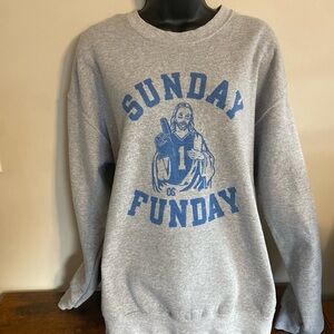 Worn once! Comfortable Gildan crewneck sweater. Features 'Sunday Funday' graphic. Ideal for relaxed wear.
