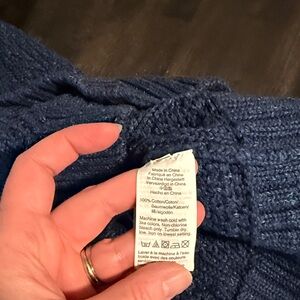 Stylish navy blue cardigan. Features cable knit design. Two front pockets. Perfect for layering.