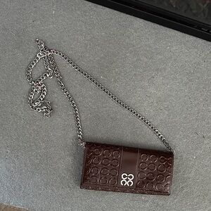 Stylish embossed wallet in rich brown. Features a unique pattern and sleek design. CHAIN INCLUDED