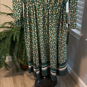 London Times Green, Gold and White Geometric Long Sleeve Dress