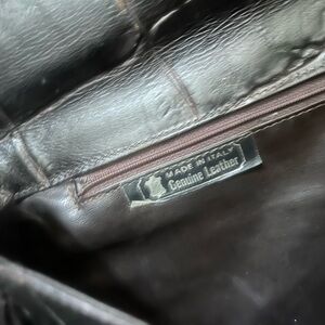 Nordstrom vintage large “crocodile” leather made in Italy from the late 1960’s early 70’s (we believe) very very very dark brown- or black with brown accents. This is an extremely well made and rare Nordstrom vintage leather bag. I say “crocodile” in quotations as that’s the pattern of the leather :). This is obviously unisex- however was originally a man’s style.