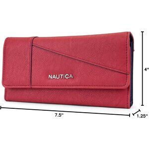 Clutch Wallet Organizer: Features a gusseted interior with fourteen credit card slots, two ID windows, two horizontal pockets, checkbook/phone compartment, and cash/receipt pockets. It includes a convenient snap closure and an exterior zip coin pocket for added organization.