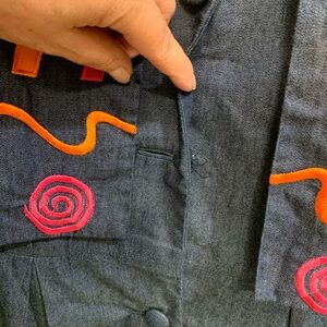 Vintage Bouillabaisse Denim Dress. Built in vest panels. Panels have different colored sown on shapes. Elastic back waist. Loops for belt (not included). Front denim buttons. Long sleeves. Colored shapes of sleeve cuffs. Back panel of dress also has colorful shapes. Please note button is missing where belt buckle should land (last picture). Dress is in good condition.