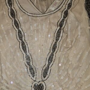 Stunning Gatsbylady London beaded dress inspired by the elegance of the Roaring 1920s. This sleeveless Art Deco–style piece features intricate beadwork and sequins over a soft nude/champagne mesh base with a flattering drop-waist silhouette.