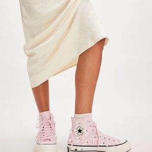 Chic light pink Converse sneakers with unique embellishments. High-top design for a trendy look.