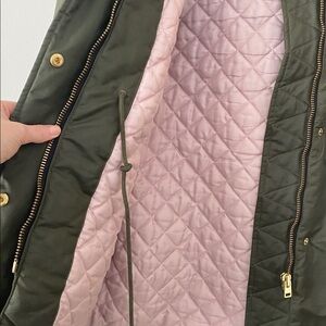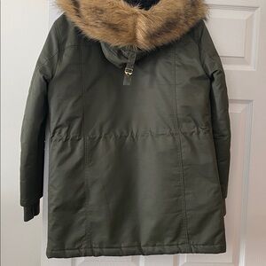 Beautiful and warm coat with light pink quilted lining. Black Sherpa hood lining and removable faux fur at the hood. Two front flap pockets. Can cinch the coat in at the waist if prefer something more fitted. I wear a size small or 6 in jcrew coats and this fits nicely with plenty of room for a sweater under. Excellent condition.
