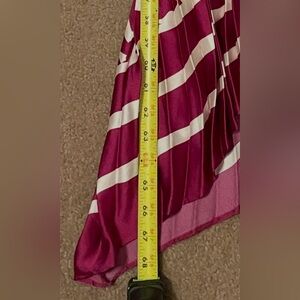Elegant burgundy and cream dress with a striking pattern. Ideal for stylish outings. Hidden pockets. Drapey Hem. Tie closure in back. Last picture shows the longest length which is 68in from shoulder.