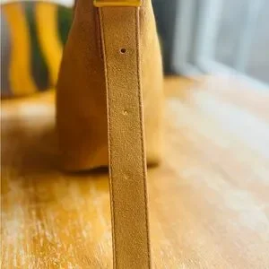 Margot New York tan suede crossbody bucket bag. She is gorgeous and in excellent condition! The slightest of wear on the bottom corners, some barely noticeable marks on the bottom, and a barely noticeable mark on the strap. The inside is clean and she is truly beautiful inside and out.