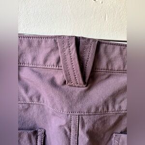 Excellent Duluth Trading Flexpedition Pants in elderberry purple. 4-way stretch, lightweight, water-repellent fabric that moves with you. Interior is peached for next-to-skin comfort. Roll up the cuffs at sundown for a flash of hidden reflective trim. Six total pockets including two large cargo pockets. Women's size 14.