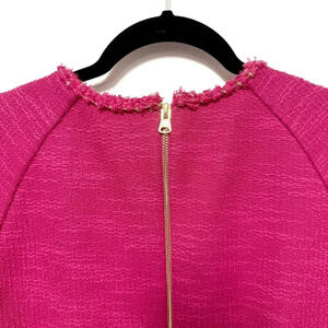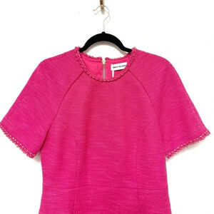 Add a pop of pink to dress day in a textured mini fixed with a cheery bit of braided trim at collar and cuffs.