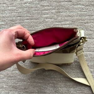 Used. Some discoloring on inside near zipper and side pocket. Some tarnishing inside connecting leather to zipper pull. Average wear