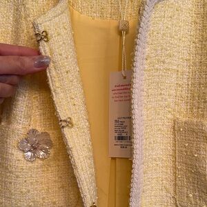 Beautiful! Never worn! Bought for the Kentucky derby! This chic yellow tweed jacket offers a sophisticated look with its elegant design and stylish details. Perfect for any occasion.