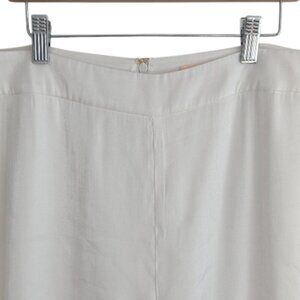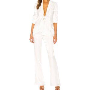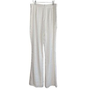 The Raquel Pants by Revolve brand Camila Coelho are high-waisted, fitted through the leg with a slight flare at the bottom. Made from a shimmery white fabric, they reflect the light in the prettiest way.