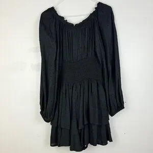 Chic & feminine long sleeve romper by Princess Polly, featuring dotted Swiss texture, smocked bodice for stretch & shaping, and tiered mini hem. Lined shorts underneath for comfort & coverage. Scoop neckline + elastic sleeves for easy wear. Perfect for concerts, girls night out, date night, or styled casually with sneakers. New with tags!