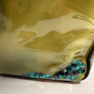 Add a playful pop to your outfit with this unique lime-green handbag! It is trimmed in bright feathers with contrasting black-and-white polka dot handles and a colorful sequined art design on the front. The base is accented with teal sequins for extra sparkle.