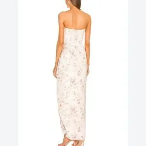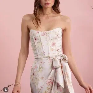 The June is a strapless full-length corset dress with a beautifully draped wrap skirt, side front slit, and a tie that can be made into a bow. Made of buttery smooth satin, it features a gorgeous floral print on a light pink background.