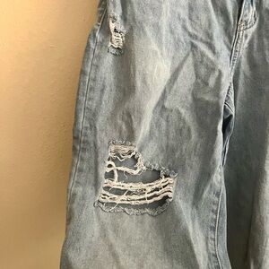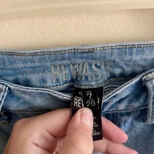 Rewash brand jeans size 7. Jeans are purposefully distressed with holes and a raw hem cropped cut. In good used condition.