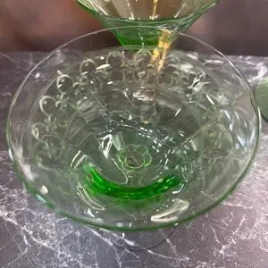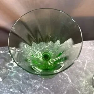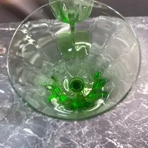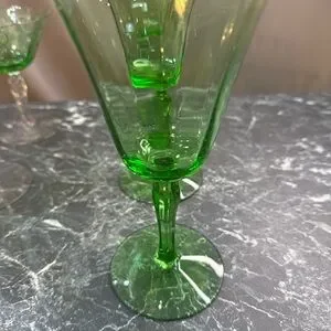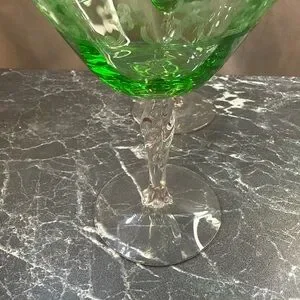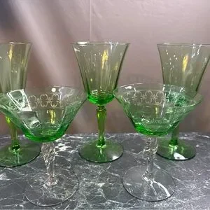 The product is a set of Fostoria Versailles (uranium glass) cocktail glasses and wine glasses made of green glow glass. The cocktail glasses are etched with a design and have a height of 5" and 7" for the wine glasses they are all green. This lot includes 2 liquor cocktail glasses and 3 wine glasses, all featuring the signature Fostoria brand and elegant design. Perfect for adding a touch of sophistication to any barware collection or for serving drinks at special occasions. These glasses are all in excellent condition please reference pics for condition and style before purchasing. Thank you