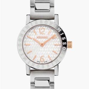 Chic Missoni watch with a silver band and pink interchangeable band. Stylish and sophisticated.