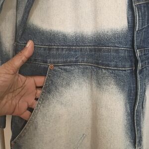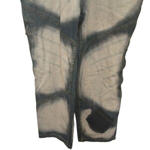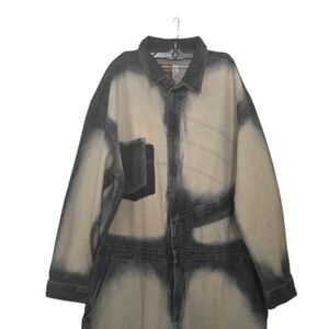 Pre-owned Noiz Vintage 90's Sandblasted Jean Coveralls with 1 Chest Pocket, 2 Front Pockets, 2 Side Zipper Pockets and 2 Back Pockets. Front Zipper Closure, Spray Paint Style Pattern, Avant Garde. Size: 2XL