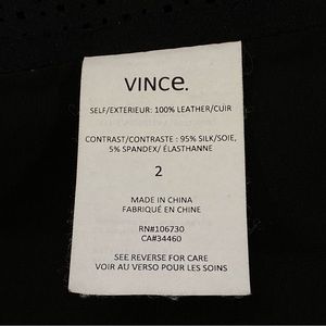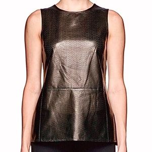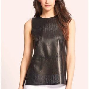 NWOT Vince perforated leather black top features laser cut perforated black leather for an edgy, yet timeless touch. Lightweight leather front has a subtle fit/flare peplum design. Unlined, semi-sheer, double layer silk back panel. Perfect for layering, or not. Side slits. Sleeveless and unlined. Lambskin leather front, back panel 95% silk, 5% spandex. Clean professionally vis leather method. Approximate flat lay measurements: shoulder 12”, bust 16”, est shoulder to bottom hem 24”.