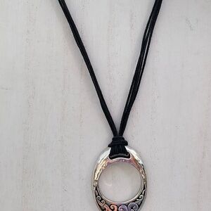 Brighton Eclipse Necklace Black Cord Silvertone Oval Filigree Pendant 15”