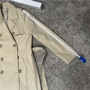 Time and True Stylish double-breasted trench coat. Features a tie belt and button details. Ideal for versatile wear.