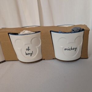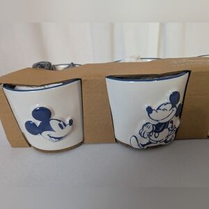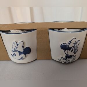 Each ceramic ramekin features classic blue-and-white sketches of Mickey & Minnie on the front, and fun sayings on the back (“oh my!”, “oh boy!”, “mickey”, “minnie”).