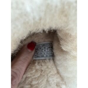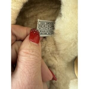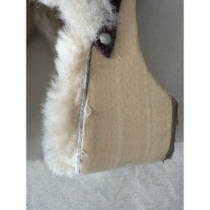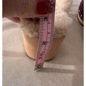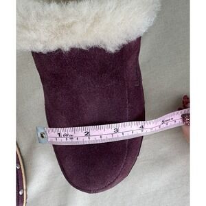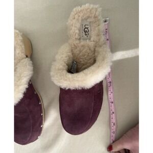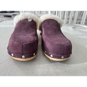 Step into cozy style with these UGG Australia shearling clogs, designed for warmth, comfort, and effortless wear. Crafted with a rich plum suede leather upper and fully lined with genuine shearling, these slip-on clogs keep feet warm while remaining breathable. The wood sole with stud detailing adds a classic Scandinavian-inspired touch, while the sturdy rubber outsole provides everyday durability. Easy slip-on design makes them perfect for fall and winter wear, lounging, errands, or casual outings. UGG logo detail on the side confirms authentic quality. Pre-owned and in very good condition with light, normal wear. From a smoke free home. A timeless UGG style that pairs beautifully with jeans, leggings, or cozy layers—priced for a fast sale and ready to wear.