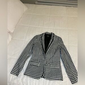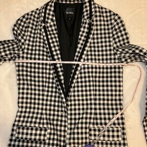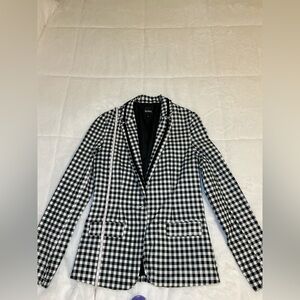 Elevate your style with this chic black and white checkered blazer. Perfect for any occasion, this jacket adds a touch of sophistication to your wardrobe. Missing button buttons in great condition