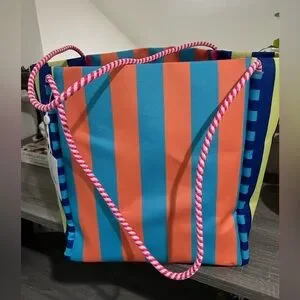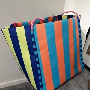 Add a splash of color to your outfit with this vibrant tote bag. Featuring bold stripes in blue, orange, and green, it's perfect for carrying your essentials in style.