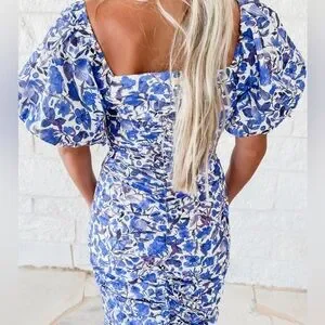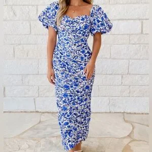 Elegant and feminine blue floral maxi dress featuring statement puff sleeves and a flattering, prim-and-proper silhouette. The ruched bodice creates a beautiful fit, while the maxi length adds timeless charm—perfect for brunch, weddings, baby showers, church, or spring/summer events.