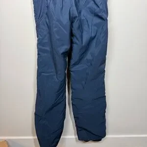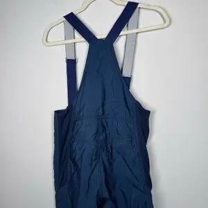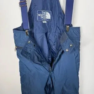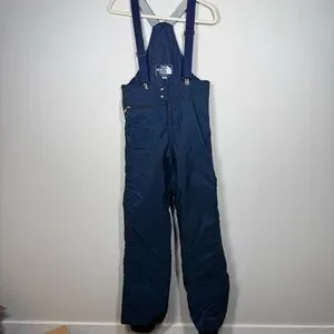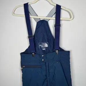 The North Face vintage insulated ski bib snow pants in a navy blue color, women’s size Medium Tall. Made in the USA with a durable nylon shell, insulated fill, adjustable elastic suspenders, zippered front pocket, snap and zip fly, and internal snow gaiters at the cuffs. Designed for cold-weather skiing, snowboarding, or winter outdoor wear with a classic full bib silhouette and longer inseam for taller fit. Good pre-owned vintage condition with normal wear consistent with age; insulation intact and hardware functional. Please see photos for details.
