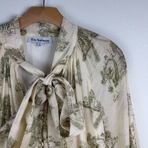 Topped by pussybow ties, this toile minidress gets floaty energy from fluttery ruffles and bead-tipped ties that give your look airy flair.