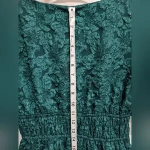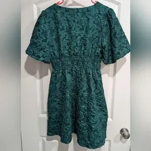 Chic mini dress with textured floral design. Features a flattering V-neck and puff sleeves. Ideal for stylish outings. Worn only once. Front closes with 2 him hook and eye fasteners. Best feature: IT HAS POCKETS!