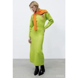 Vibrant neon green knit midi dress from ZARA, crafted from a soft wool and viscose blend. Features a sleek fitted silhouette, long sleeves, and a mock neckline for a modern, minimalist look. The fabric offers slight stretch for comfort and shape retention.