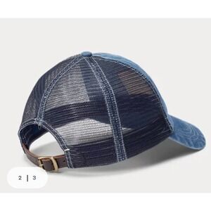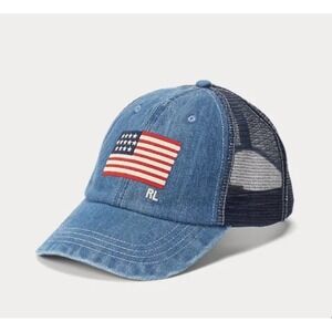 Polo Ralph Lauren Flag Denim Ball Cap Mesh Leather Strap Blue Adjustable NWT