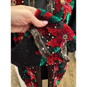 Striking vintage Carina beaded and sequin blazer featuring rich red and green floral embellishment on a black base. This statement piece is beautifully crafted with dense beadwork and sequins arranged in bold floral motifs, giving it a luxe, eye-catching look perfect for special occasions or elevated styling.