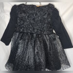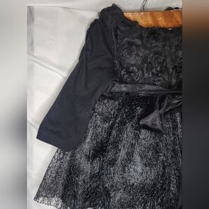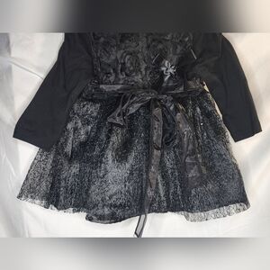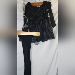 Elegant black lace dress with matching tights. Features a floral lace pattern and a satin bow. Size 9 mo.