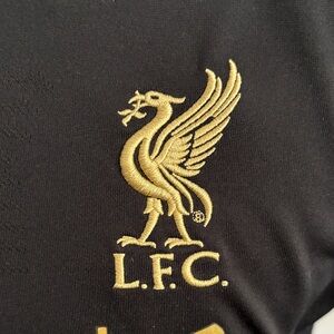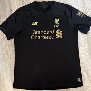 Stylish New Balance jersey in black with gold accents. Comfortable and perfect for sports or casual wear. This is the New Balance Liverpool FC 2019-2020 Home Goalkeeper Jersey, which features a black design with gold accents for the club crest and sponsor logos. This specific shirt was worn by goalkeepers like Alisson Becker during the historic season where Liverpool won their first top-division title in 30 years.